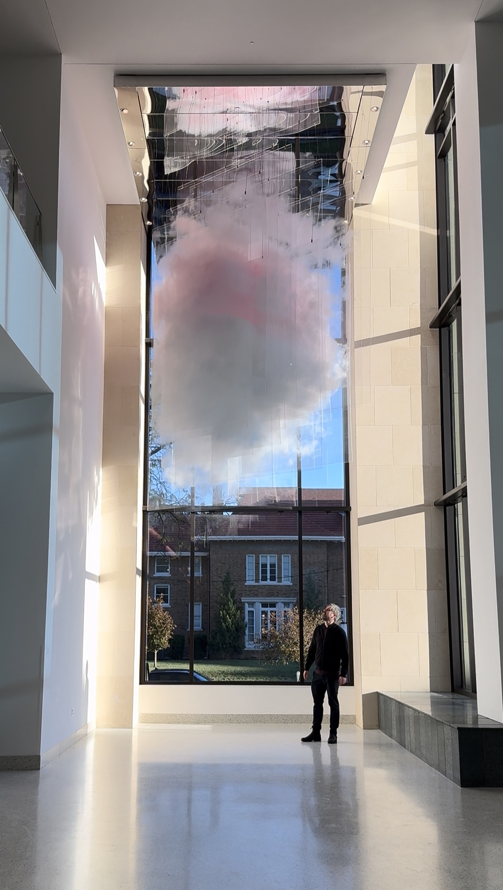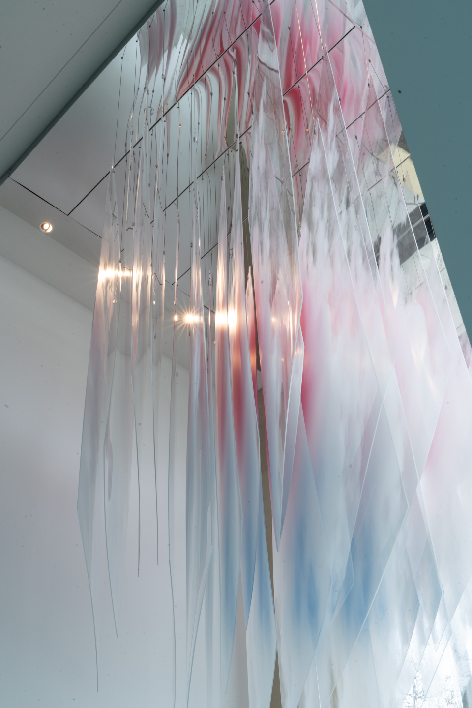 Layers of transparent panels, each carrying a faint tonal layer, align in space to form a luminous three-dimensional volume that appears to change with every step you take. The work invites slow looking and movement around it. Walk beneath it and the shape disappears only to form again from another angle, an experience shaped by your own movement and line of sight.