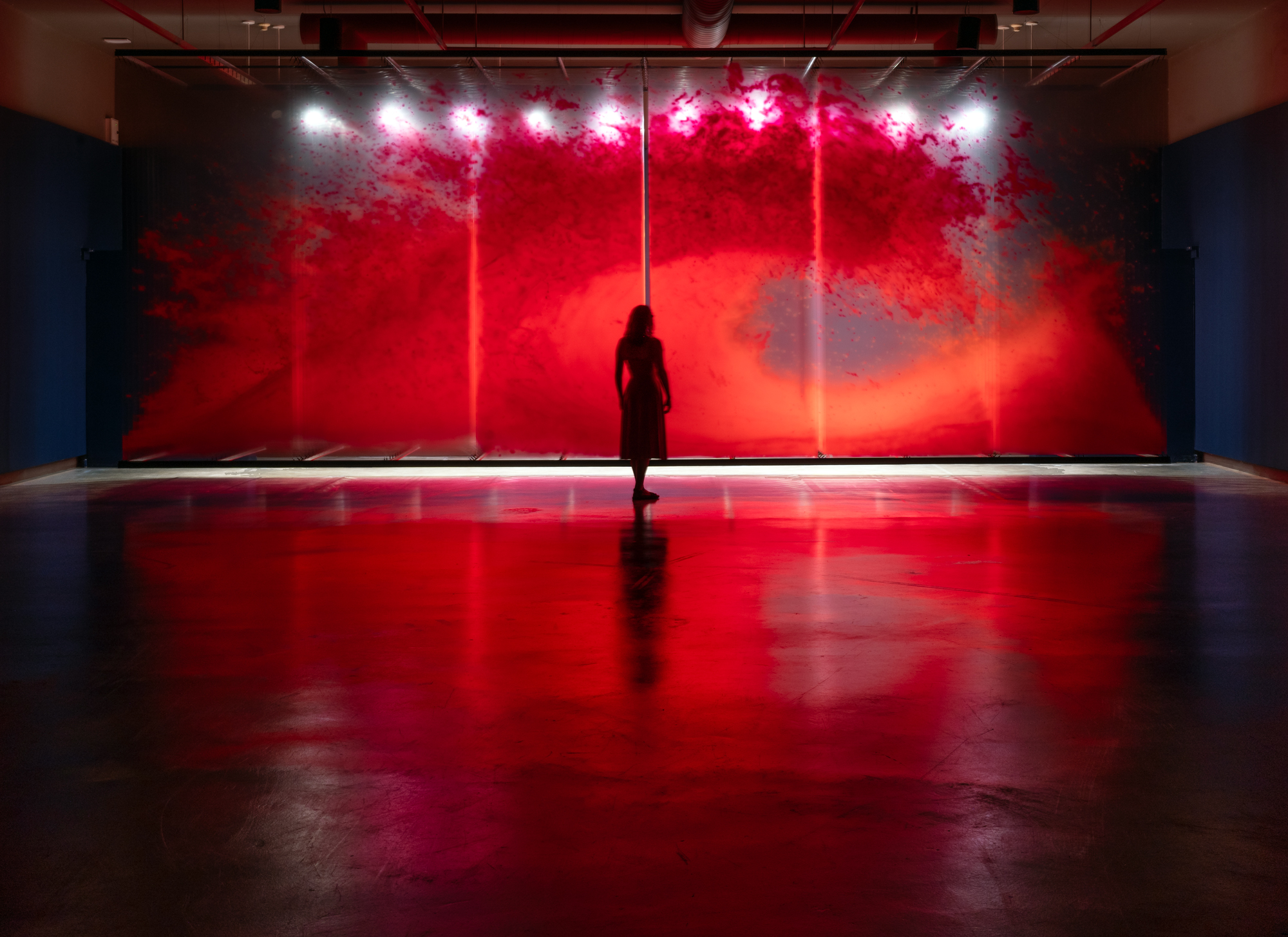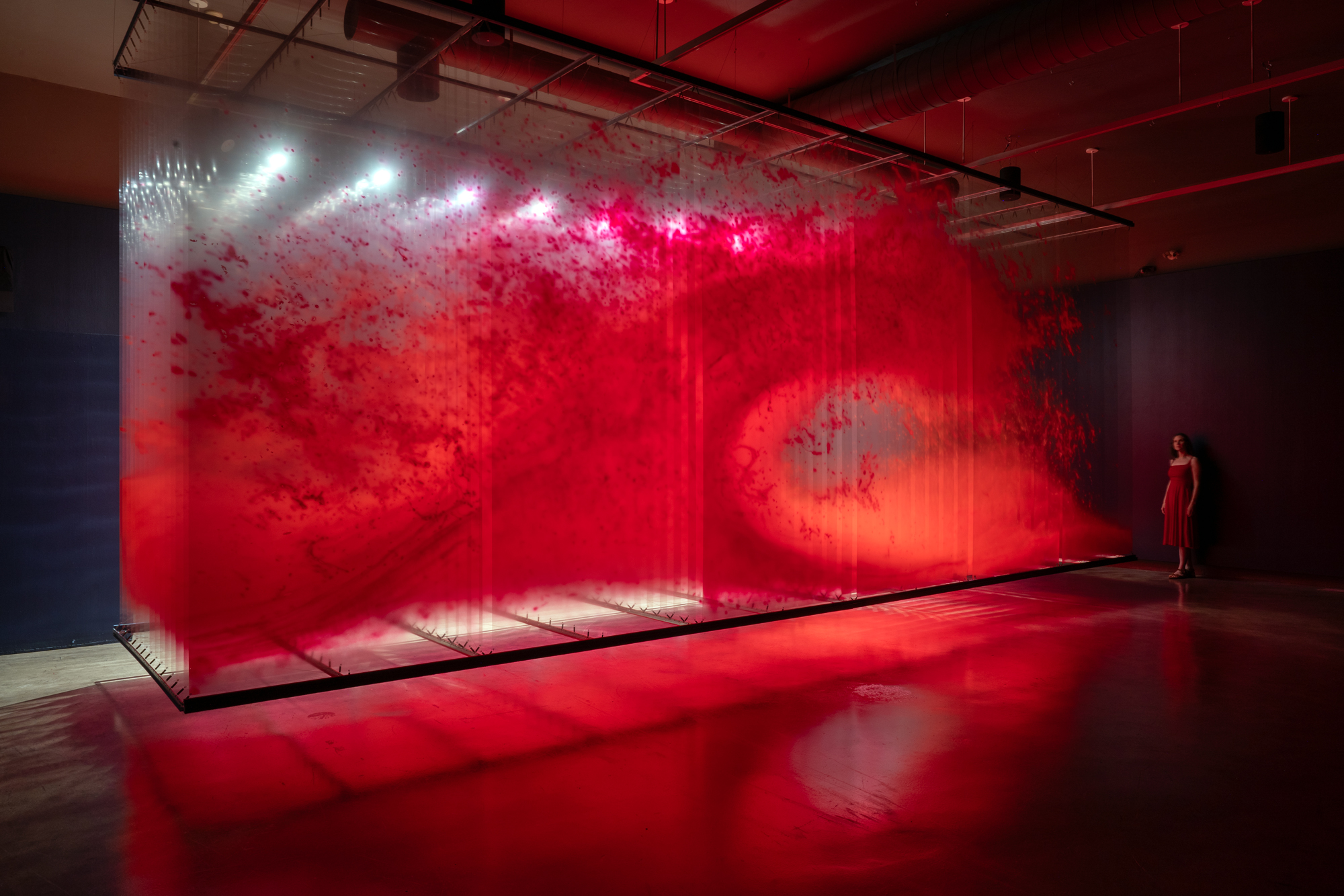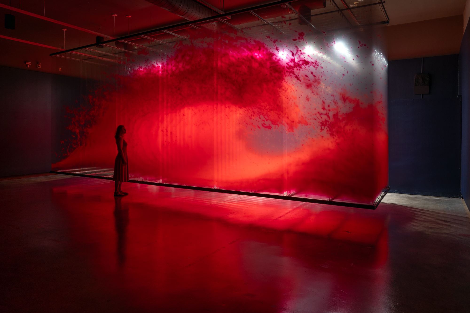 Philosopher Maurice Merleau-Ponty noted that perception is always embodied; First Wave proves the insight by folding viewers into its intense red field, making physical presence essential to seeing. Red signals blood and danger imbuing the installation with quiet unease and relationship with the body.