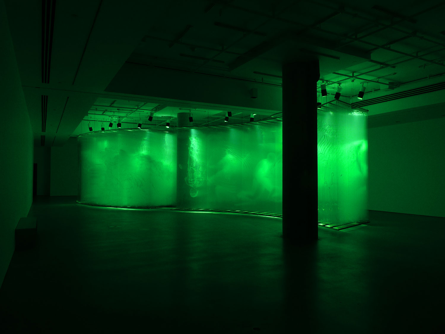 Presented as if in suspended animation, the luminous installation offers a synthesized perception of the represented bodies and masses, referents of the contemporary power whose chromatic resonances belong to the military, artistic, social and technological spheres. The aim of Spriggs’ approach is to surprise reality in order to immobilize it, the better to identify the figures that govern the power. In this, his strategy is not unlike the anamorphic process: rather than creating a vanishing point for the viewer’s eye, he inverts the conventions of perspective so that the viewer becomes the vanishing point. The large scale favoured by the artist and the curved shape of the sections serve to flood the visitor’s gaze. The work occupies nearly the entire field of vision in the gallery, producing a cinematic effect in which the iconography reads like a montage composed so as to simultaneously fuse and confuse the information. This effect functions like our own perception of reality, which is most often shaped by a montage of temporalities produced by the new technologies that redefine our grasp of events. The Internet remains the principal symbol of this. Thus, even while making the viewer omniscient, the work testifies to the fact that an overabundance of images can also be blinding. (Text by Marie-Eve Beaupré)
